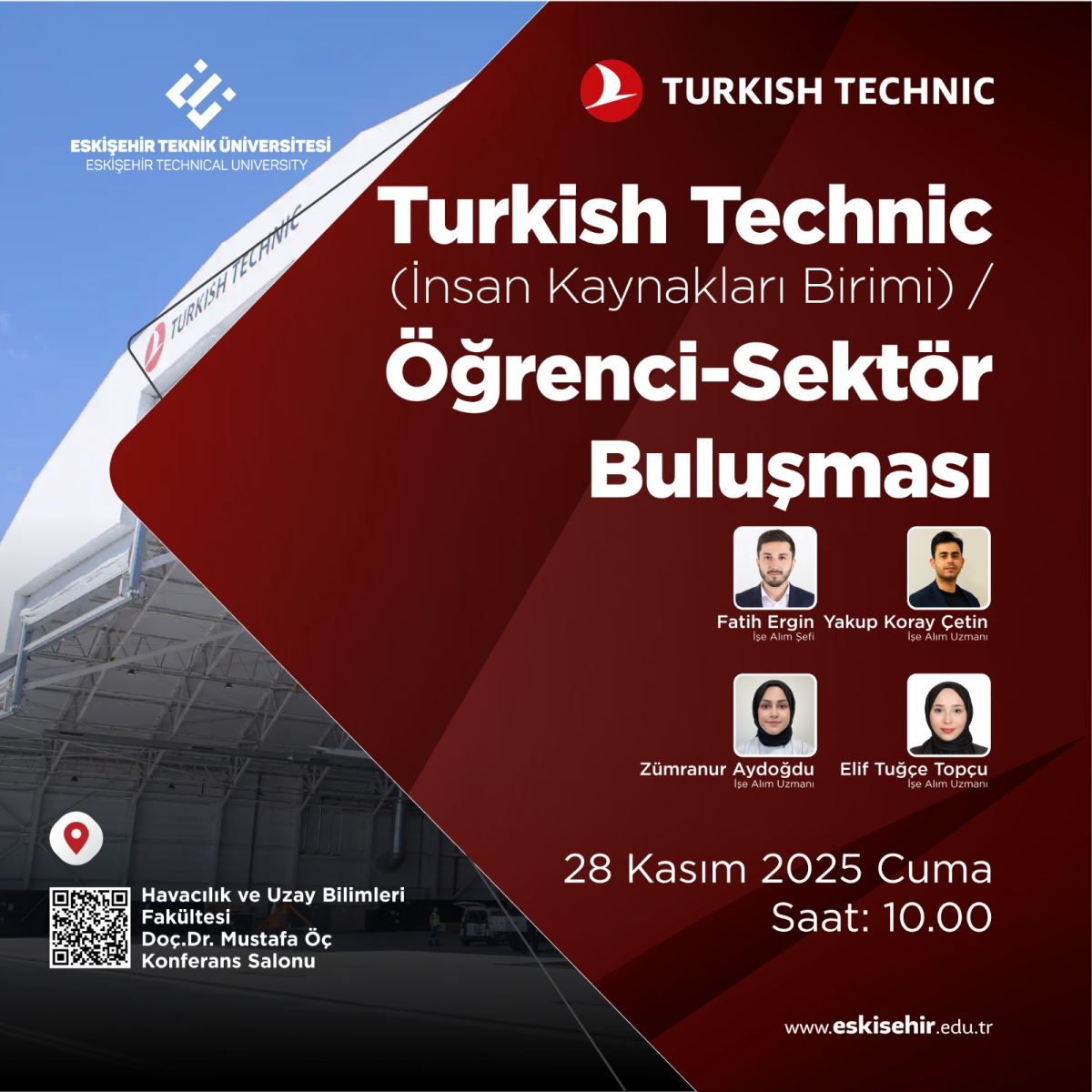 28 Kasım 2025 Cuma günü saat 10.00'da Turkish Technic İnsan Kaynakları Uzmanlarının katılımı ile Havacılık ve Uzay Bilimleri Fakültesi Doç. Dr. Mustafa ÖÇ konferans salonunda öğrenciler ile söyleşi gerçekleştirilecektir. Öğrencilerimizi etkinliğimize bekliyoruz....
