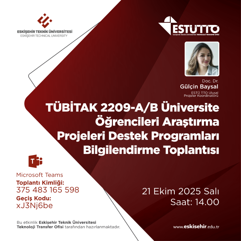 Bu çağrıya ilişkin olarak, Eskişehir Teknik Üniversitesi Teknoloji Transfer Ofisi (ESTÜ TTO) tarafından 21 Ekim 2025 Salı günü saat 14:00'te "TÜBİTAK 2209-A/B Üniversite Öğrencileri Araştırma Projeleri Destek Programı Bilgilendirme Toplantısı" etkinliği çevrimiçi olarak düzenlenecektir. Etkinlik kapsamında TÜBİTAK 2209-A/B programlarının tanıtımı yapılacak olup, programların başvuru dokümanları üzerinden proje hazırlama sürecinde dikkat edilmesi gereken hususlara yönelik öneriler sunulacaktır. Etkinliğe Üniversitemizin tüm öğretim elemanları ve öğrencileri davetlidir.